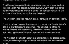 Лауреат Нобелевской премии мира, венесуэльская оппозиционерка Мария Корина Мачадо призвала Трампа к «военной эскалации», поскольку считает это единственным способом свергнуть Мадуро