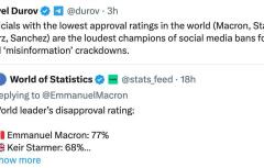 По его словам, французский президент Макрон, британский премьер Стармер, немецкий канцлер Мерц и испанский премьер Санчес, продвигая запрет соцсетей для детей при этом являются «чиновниками с самыми низкими рейтингами в мире» .