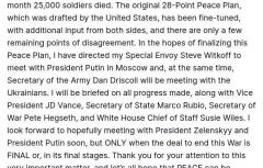 Он отметил, что план из 28 пунктов по Украине может быть положен в основу окончательно мирного урегулирования, но предметно с РФ текст не обсуждается.