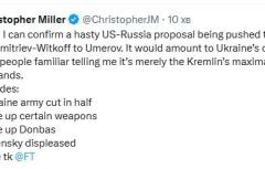 План мира от США и России включает отказ Украины от Донбасса, сообщил журналист The Financial Times Кристофер Миллер.