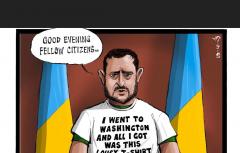 Британская газета The Telegraph опубликовала карикатуру на вечернее обращение Зеленского после его поездки к Трампу.