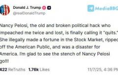 Трамп назвал экс-спикера Палаты представителей Нэнси Пелоси «изношенной аферистской» и заявил, что рад ее скорому уходу из политики, так как «исчезнет вонь»