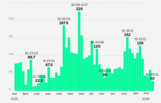 Особенно заметным стало замедление в последнюю неделю – с 19 по 25 января российская армия продвинулась всего на 30,4 кв. км, что является минимумом с весны 2025 года.