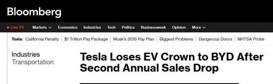 Tesla потеряла лидерство на рынке электромобилей – первое место заняла китайская компания BYD, - Bloomberg