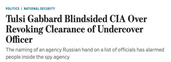 The Wall Street Journal сообщает, что директор нацразведки США Тулси Габбард по ошибке раскрыла имя сотрудника ЦРУ, работавшего под прикрытием