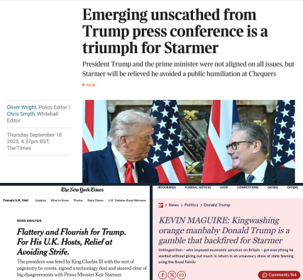 «Хотя тон был тёплым, а президент не скупился на похвалы Стармера, их разногласия — от Газы до достоинств ветряных турбин — были очевидны. Хотя Стармер был рад услышать от Трампа, что президент Путин «действительно подвел его», не было никаких признаков того, что эти чувства перерастут в более сильную поддержку Украины. Президент прямо заявил, что признание Великобританией палестинского государства является «одним из наших немногих разногласий». Трамп предложил Стармеру «привлечь военных», чтобы положить конец нелегальной миграции. Президент, по-видимому, призвал Великобританию активнее использовать нефть и газ Северного моря, а не «дорогую шутку» с ветроэнергетикой, к которой склоняется Стармер. Но по меркам Трампа он был сдержан. Он намеренно уклонялся от ответов на провокационные вопросы о свободе слова в Великобритании, несмотря на свои общеизвестные взгляды на этот вопрос», - пишет The Times.