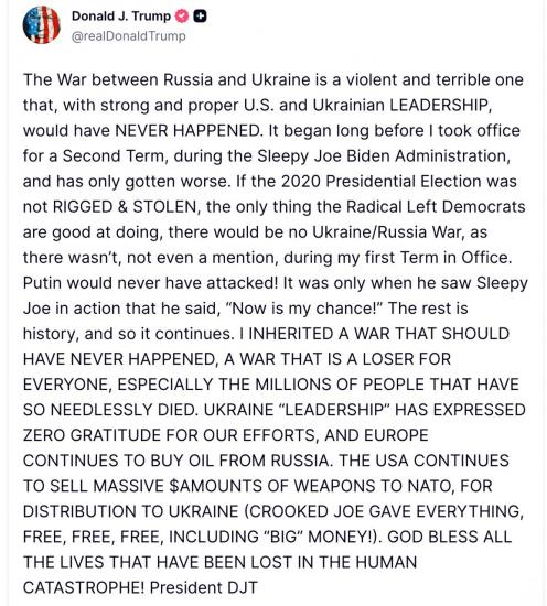 «Война между Россией и Украиной — жестокая и ужасная, и при сильном и правильном руководстве США и Украины она бы никогда не случилась. Она началась задолго до того, как я вступил в должность во второй раз, при администрации Сонного Джо Байдена, и лишь ухудшалась», - заявил Трамп.