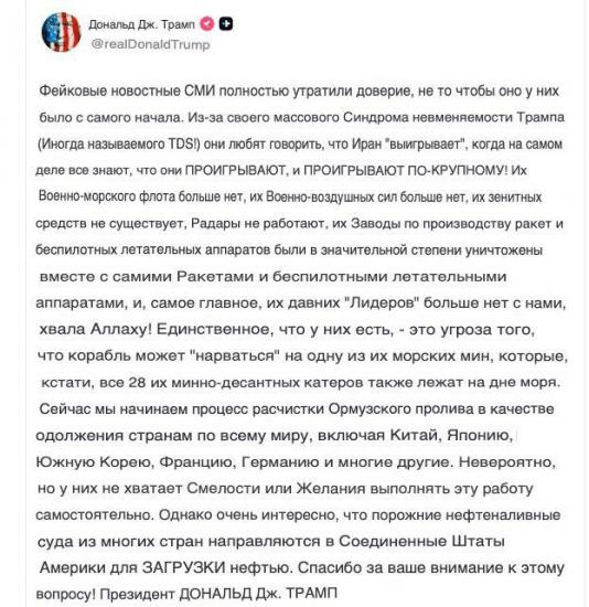 А журналист Axios Барак Давид сообщает, что несколько кораблей ВМС США сегодня пересекли Ормузский пролив без согласования с Ираном. По его словам, это произошло первый раз с момента начала войны.