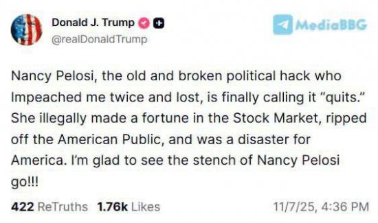 "Нэнси Пелоси, старая и изношенная политическая аферистка, которая дважды пыталась объявить мне импичмент и проиграла, наконец-то уходит в отставку. Она незаконно заработала состояние на фондовом рынке, обманула американскую общественность и была катастрофой для Америки.