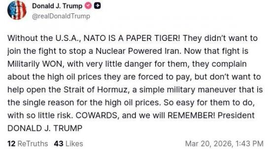Трамп назвал "трусами" союзников по НАТО и пообещал "запомнить", что они отказались от его миссии по разблокированию Ормузского пролива, которую он считает очень простой