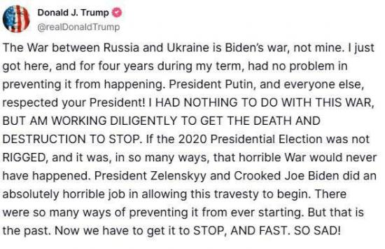 Я не имел никакого отношения к этой войне, но сейчас прилагаю усилия, чтобы остановить смерть и разрушения. Если бы президентские выборы 2020 года не были сфальсифицированы, этой ужасной войны никогда бы не произошло. Президент Зеленский и Лживый Джо Байден сделали ужасную работу, позволив начаться этой трагедии. Существовало множество способов её предотвратить. Но это уже в прошлом. Сейчас нужно остановить это - и быстро», - написал Трамп.