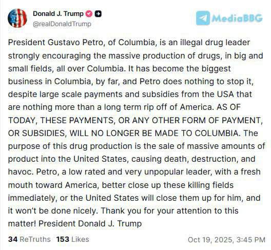 "Президент Густаво Петрo из Колумбии является лидером незаконного оборота наркотиков и активно поощряет массовое производство наркотиков на больших и малых плантациях по всей стране. Это стало крупнейшим бизнесом в Колумбии, и Петрo не предпринимает никаких мер для его остановки, несмотря на крупные выплаты и субсидии со стороны США, которые на самом деле являются долгосрочной «обманной схемой» для Америки. С настоящего дня эти выплаты или любые другие формы финансовой помощи, субсидий больше не будут предоставляться Колумбии", - написал Дональд Трамп.