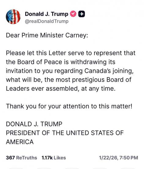 "Пожалуйста, примите это письмо как официальное уведомление о том, что Совет мира отзывает свое приглашение в отношении присоединения Канады", - написал Трамп.