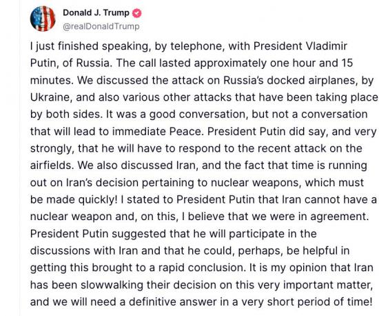 "Я только что закончил разговор по телефону с президентом России Владимиром Путиным. Разговор длился примерно один час и 15 минут. Мы обсудили нападение Украины на пристыкованные самолеты России, а также различные другие атаки, которые происходят с обеих сторон. Это был хороший разговор, но не тот разговор, который приведет к немедленному Миру. Президент Путин действительно сказал, и очень решительно, что ему придется ответить на недавнюю атаку на аэродромы. Мы говорили и об Иране, и о том, что время на решение Ирана по ядерному оружию истекает, и оно должно быть принято быстро! Я заявил президенту Путину, что у Ирана не может быть ядерного оружия, и в этом я считаю, что мы были согласны. Президент Путин предположил, что он примет участие в переговорах с Ираном и, возможно, будет полезен в скорейшем их завершении. По моему мнению, Иран медлит с принятием решения по этому очень важному вопросу, и нам понадобится окончательный ответ в очень короткий период времени!" - написал президент США.