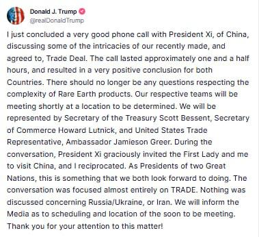 «Как президенты двух великих наций, мы оба с нетерпением ждем этой встречи. Беседа была почти полностью посвящена торговле . Ничего не обсуждалось по поводу России/Украины или Ирана. Мы сообщим СМИ о дате и месте предстоящей встречи», - пишет Трамп.
