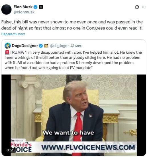 «Илон "изнашивался", я попросил его уйти, я отобрал его мандат на электромобили, который заставлял всех покупать электрические машины, которые никто больше не хотел (он знал об этом месяцами, что я собираюсь это сделать!), и он просто сошел с ума!» – написал президент США в своей соцсети Truth.