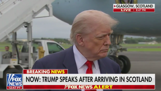 Трамп прибыл в Шотландию, где у него сегодня состоятся переговоры с главой Еврокомиссии Урсулой фон дер Ляйен о вероятной торговой сделке (если ее не удастся достичь, США вводят 30-процентные пошлины против ЕС уже с 1 августа)