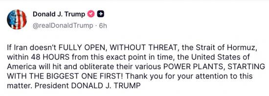 “Если Иран не откроет полностью, без угрозы, Ормузский пролив в течение 48 часов с этого момента, США нанесут удар и уничтожат их различные электростанции, начиная с самой крупной”, - говорится в публикации.