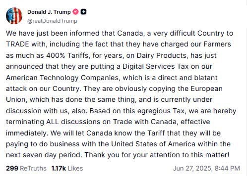 Трамп разрывает переговоры с Канадой и угрожает ей новыми пошлинами за введенный ею налог