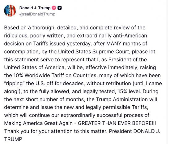 "Я, как Президент Соединённых Штатов Америки, с немедленным вступлением в силу повышаю 10-процентный глобальный тариф для стран, многие из которых десятилетиями "обдирали" США без всякого возмездия (пока не появился я!), до полностью допустимого и юридически проверенного уровня в 15%.