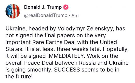"Украина во главе с Владимиром Зеленским не подписала окончательные документы по очень важному соглашению о редкоземельных элементах с Соединенными Штатами. Оно опоздало как минимум на три недели. Надеюсь, оно будет подписано НЕМЕДЛЕННО", - заявил Трамп.