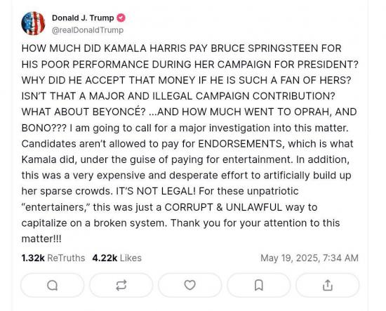 «Сколько Камала Харрис заплатила Брюсу Спрингстину (фронтмен группы The E Street Band - Ред.) за его слабое выступление во время её президентской кампании?