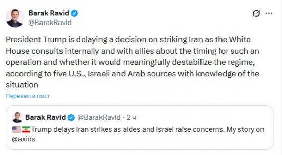 По его словам, Трамп откладывает принятие решения о возможных ударах по Ирану, чтобы провести дополнительные консультации в Белом доме и с союзниками.