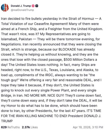 «Иран вчера решил открыть огонь в Ормузском проливе - это полное нарушение нашего соглашения о прекращении огня! Многие из них были направлены на французское судно и грузовое судно из Великобритании. Это было не очень хорошо, правда?» - написал Трамп.