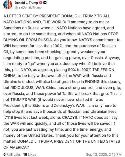 "ПИСЬМО ПРЕЗИДЕНТА Д. ТРАМПА КО ВСЕМ НАРОДАМ СТРАН НАТО И МИРУ. Я готов к большим санкциям против России если остальные страны НАТО согласятся сделать то же самое и когда все страны НАТО ПРЕКРАТЯТ ЗАКУПАТЬ НЕФТЬ ИЗ РОССИИ. Как вы знаете, вовлеченность НАТО в ПОБЕДУ гораздо меньше 100%, и покупка нефти из России некоторыми из членов шокирует! Это сильно ослабляет вашу переговорную позицию с Россией. В любом случае, я готов "начать" когда будете готовы вы. Просто скажите когда? Я верю что эти меры, плюс то что НАТО как группа поставит 50% или 100% ТАРИФЫ НА ТОРГОВЛЮ С КИТАЕМ которые будут отозваны после прекращения войны России и Украины, очень сильно помогут ЗАКОНЧИТЬ эту ГЛУПУЮ и БЕССМЫСЛЕННУЮ ВОЙНУ. Китай имеет сильный контроль и даже хватку над Россией, и эти сильные тарифы смогут ослабить такую хватку. Это не ВОЙНА ТРАМПА (и она никогда бы не началась будь я президентом), это ВОЙНА Байдена и Зеленского. Я здесь единственный кто помогает остановить её и спасти тысячи жизней русских и украинцев (7,118 жизней потеряно только на прошлой неделе, БЕЗУМИЕ!). Если НАТО сделает как я скажу, эта ВОЙНА закончится быстро и все эти жизни будут спасены! Если нет, вы просто тратите мое время, а так же время, энергию и деньги Соединенных Штатов", - написал Трамп.
