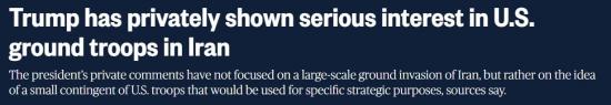 "Заявления президента, выражающие серьезный интерес к развертыванию сухопутных войск, не касались крупномасштабного наземного вторжения в Иран, а скорее идеи небольшого контингента американских войск, который будет использоваться для конкретных стратегических целей, сообщили американские чиновники, бывший американский чиновник и человек, знакомый с ходом обсуждений. Они заявили, что Трамп не принимал никаких решений и не отдавал никаких приказов, касающихся сухопутных войск", - пишет NBC.