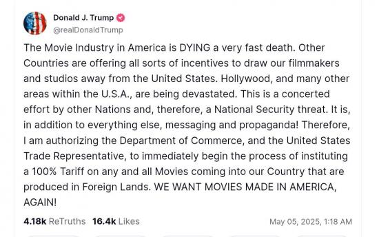 Поэтому я уполномочиваю Министерство торговли и Торгового представителя Соединенных Штатов немедленно начать процесс введения 100%-ной пошлины на все фильмы, поступающие в нашу страну", - написал Трамп в своей соцсети.