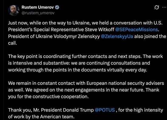"Только что, по пути в Украину, мы провели беседу со специальным представителем президента США Стивом Виткоффом. К разговору также присоединился Зеленский.