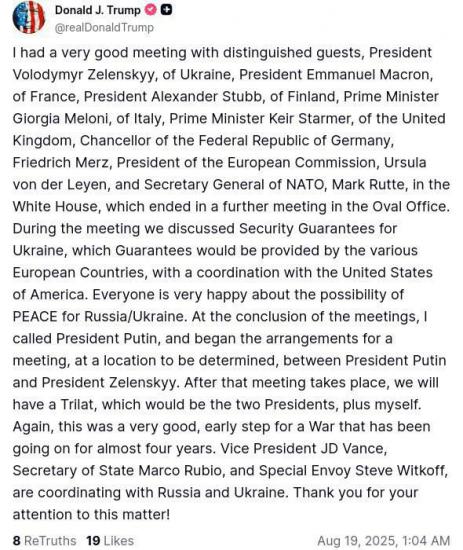 «Во время встречи мы обсудили гарантии безопасности для Украины, которые будут предоставлены различными европейскими странами в координации с Соединёнными Штатами Америки. Все очень довольны возможностью достижения мира между Россией и Украиной. По завершении встречи я позвонил президенту Путину и начал организацию встречи, место проведения которой ещё предстоит определить, между Путиным и Зеленским. После этой встречи состоится трёхсторонний формат — два президента и я. Ещё раз отмечу, что это был очень хороший шаг на пути к завершению войны, которая продолжается уже почти четыре года», - написал Трамп.