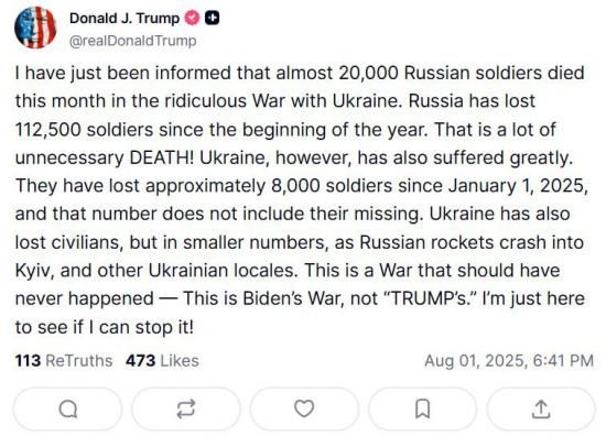 Трамп заявил, что РФ потеряла с начала года 112,5 тысяч военных, а Украина – 8 тысяч