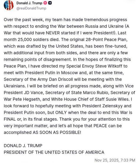 «За последнюю неделю моя команда добилась огромного прогресса в отношении прекращения войны между Россией и Украиной (война, которая никогда бы не началась, если бы я был президентом!). В прошлом месяце погибло 25 000 солдат. Первоначальный мирный план из 28 пунктов, который был разработан Соединенными Штатами, был доработан, с дополнительным вкладом с обеих сторон, и осталось лишь несколько моментов разногласий. В надежде завершить мирный процесс я поручил своему специальному посланнику Стиву Уиткоффу встретиться с президентом Путиным в Москве, и в то же время министр армии Дэн Дрисколл встретится с украинцами. Я буду проинформирован обо всем достигнутом прогрессе вместе с вице-президентом Джей Ди Вэнсом, государственным секретарем Марко Рубио, военным министром Питом Хегсетом и начальником штаба Белого дома Сьюзи Уайлс. Я с нетерпением жду встречи с президентом Зеленским и президентом Путиным в ближайшее время, но только тогда, когда сделка по прекращению этой войны будет окончательной или на заключительной стадии. Спасибо за внимание к этому очень важному вопросу, и будем надеяться, что мир может быть достигнут как можно скорее!», – написал Трамп в своей соцсети.
