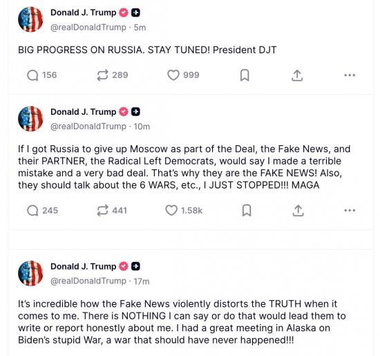 У меня была отличная встреча на Аляске по поводу глупой войны Байдена — войны, которой никогда не должно было быть! Если бы я добился того, чтобы Россия отказалась от Москвы в рамках сделки, фейк-ньюс и их партнеры — радикальные левые демократы — сказали бы, что я совершил ужасную ошибку и заключил очень плохую сделку», - написал президент США.