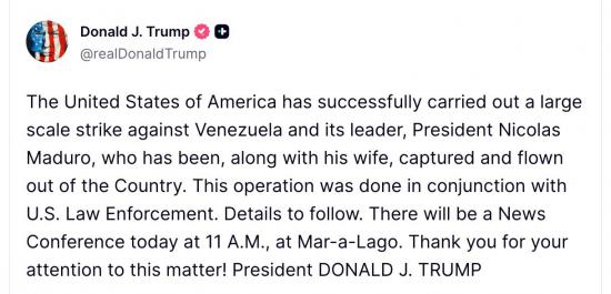"Соединённые Штаты Америки успешно провели масштабный удар по Венесуэле и её лидеру, президенту Николасу Мадуро, который вместе с женой был захвачен и вывезён из страны.