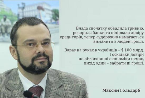 И, как Максим Гольдарб отметил: «Власть сначала обвалила гривню, разорила банки и подорвала доверие кредиторов, теперь судорожно пытается выманить у людей деньги. Сейчас на руках у украинцев – 100 млрд.дол.США, и поскольку доверия к отечественной экономики нет, выход один – забрать эти деньги».