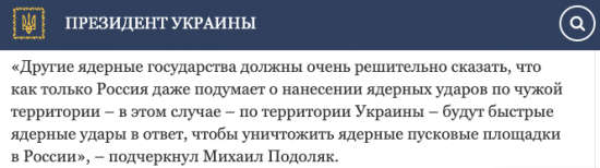 Советник главы ОПУ Михаил Подоляк призвал ядерные державы предупредить президента РФ Владимира Путина о возможности ядерного удара по территории РФ. Причём, как выходит из слов Подоляка, превентивного.