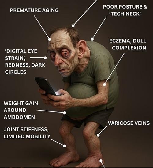 Длительное сидение или наклон над экранами способствует наклону головы вперед и искривлению верхней части спины, что также известно как «технологическая шея».