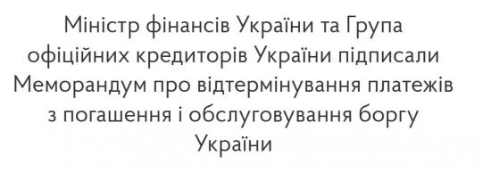 В сообщении говорится, что министр финансов Украины Сергей Марченко и представители Группы официальных кредиторов из стран G7 и Парижского клуба подписали меморандум о взаимопонимании относительно отсрочки выплат по государственному и гарантированному государством долгу Украины.