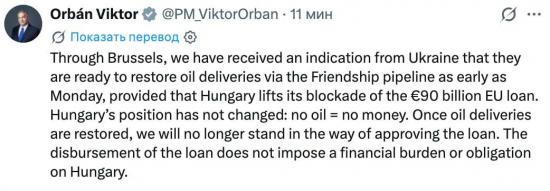 «Через Брюссель мы получили сигнал от Украины о том, что они готовы возобновить поставки нефти по трубопроводу «Дружба» уже с понедельника при условии, что Венгрия снимет блокировку кредита ЕС на 90 миллиардов евро. Позиция Венгрии не изменилась: нет нефти - нет денег. После возобновления поставок нефти мы больше не будем препятствовать одобрению кредита», - заявил Орбан.