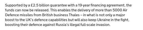 «Благодаря гарантии в размере 2,5 миллиарда фунтов стерлингов и 19-летнему соглашению о финансировании, средства теперь могут быть выделены. Это позволит поставить более 5000 ракет противовоздушной обороны от британской компании Thales», — говорится в сообщении.