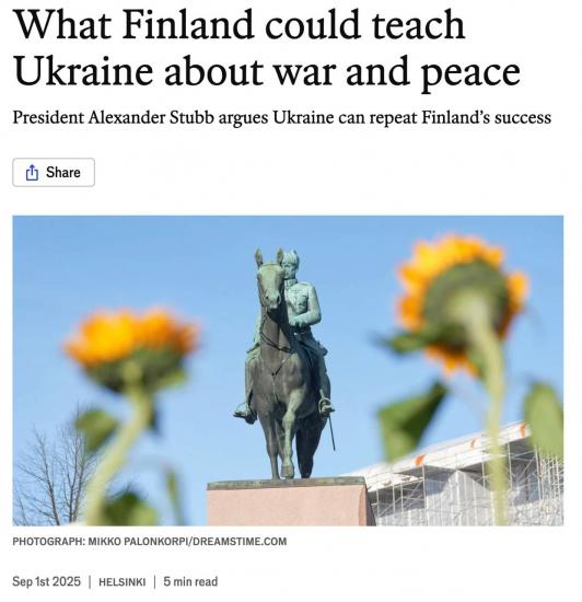 Издание напоминает заявление президента Финляндии Стубба на недавней встрече с Трампом в Белом доме, что «мы нашли решение в 1944 году, и я уверен, что мы сможем найти решение в 2025 году, чтобы положить конец агрессивной войне России, найти и добиться прочного и справедливого мира».