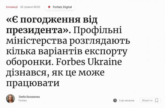 Украина может вскоре начать экспорт оружия, который юридически не запрещен, но по факту производители не получают на это разрешение, - Forbes со ссылкой на источники