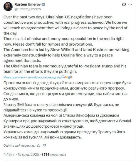 «За последние два дня украинско-американские переговоры были конструктивными и продуктивными, достигнут реальный прогресс. Мы надеемся, что к концу дня мы достигнем соглашения, которое приблизит нас к миру», - пишет секретарь СНБО и глава переговорной делегации.