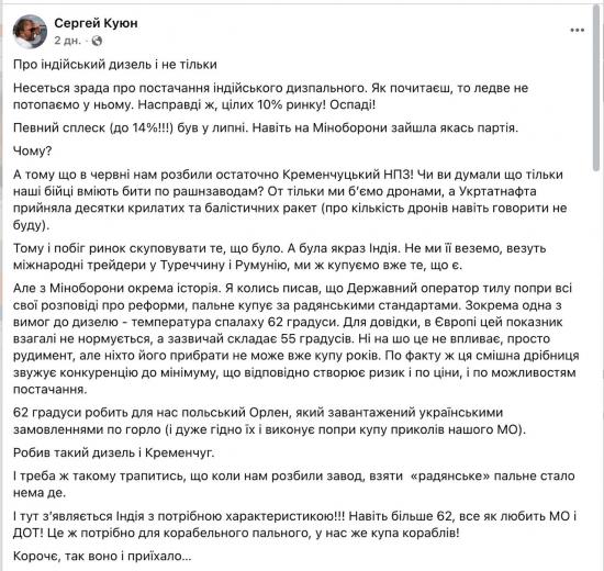 «Поэтому рынок поспешил скупить все, что было в наличии. А в наличии было топливо из Индии. Мы не транспортируем его, международные трейдеры транспортируют его в Турцию и Румынию, а мы покупаем то, что уже доступно», — пишет Куюн.