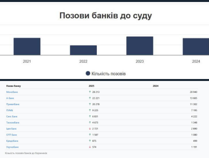 Если говорить о динамике судебной деятельности банков, то активнее всего в 2025 году увеличивалось количество судебных исков у ТАСкомбанка — в 3,5 раза, Приватбанка — в 1,8 раза, Кредобанка — в 1,7 раза, А-Банка — в 1,6 раза и Сенс Банка — в 1,6 раза. А сокращение по судебным спорам произошло у Юнекс Банка (в 4 раза), Креди Агриколь Банка (в 2 раза) и Укргазбанка (в 2 раза).