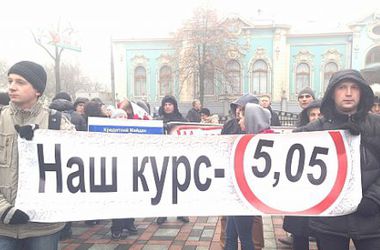 Среди участников акции – валютные заемщики, а также те, кого не устраивает ситуация с падением курса национальной валюты. К зданию Верховной Рады сносят покрышки.