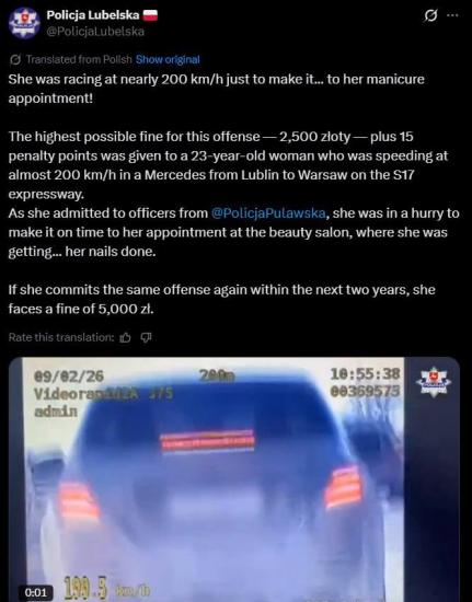 В официальном заявлении полиции приводится пояснение девушки, которая заявила что ехала со скоростью 200 км\час из-за того что спешила из Люблина в Варшаву в салон на маникюр.